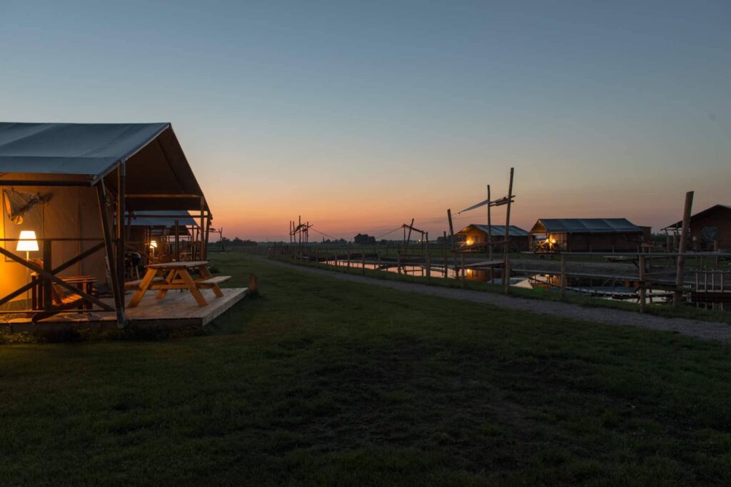 De 10 luxe tenten staan op een gezellig veld, met uitzicht op de weilanden en de Water Pret Weide. Vanaf 2024 is er een apart veld voor gasten met eigen kampeermiddel.